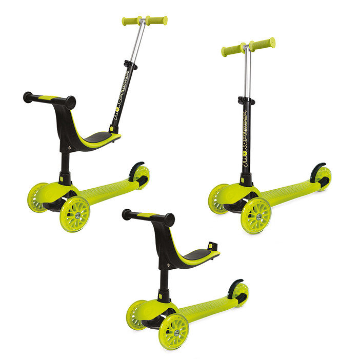 Λειτουργία scooter: Το παιδί έχοντας πλέον αναπτύξει την ισορροπία του και νιώθοντας πια σίγουρο για τις οδηγικές του δεξιότητες, είναι έτοιμο να χρησιμοποιήσει το scooter με πλήρη αυτονομία και να διασκεδάσει κάνοντας ατελείωτες βόλτες, με άνεση, ασφάλεια και στυλ. Με μια εύκολη αναπροσαρμογή, αφαιρώντας την εργονομική θέση και προσαρμόζοντας το χερούλι καθοδήγησης γονέα στο μπροστινό μέρος του scooter, το πατίνι ισορροπίας μετατρέπεται σε scooter με τρεις ρόδες. Πλέον το παιδί μπορεί να μάθει να οδηγεί το scooter, να εξασκήσει τις κινητικές του δεξιότητες, την ισορροπία του αλλά και το συνολικό συντονισμό μερών του σώματός του, ώστε να μπορεί να απολαύσει τη βόλτα του με άνεση και ασφάλεια. Το scooter στρίβει γέρνοντας το τιμόνι προς τα αριστερά ή δεξιά και με την αντίστοιχη μετάθεση του βάρους του σώματος προς την πλευρά στροφής.