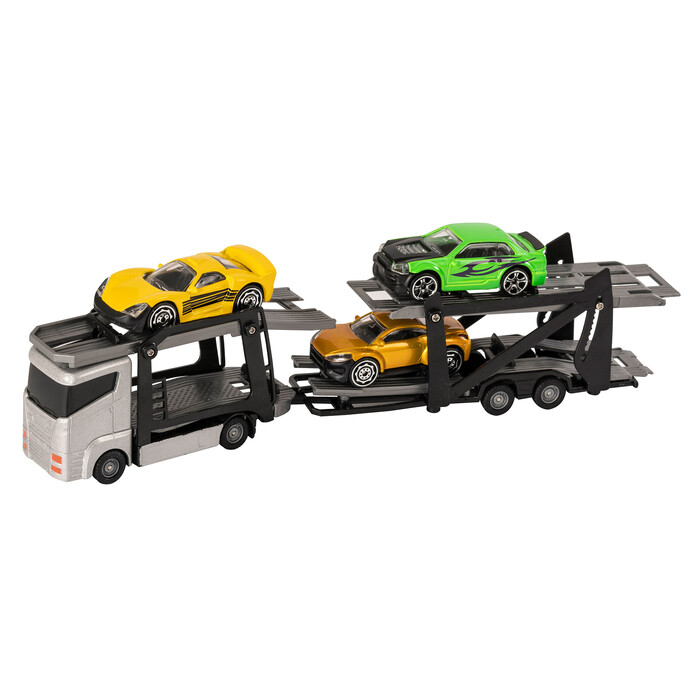 Vehicles set with transporter truck & 3 die-cast cars of scale 1:64. Available in 2 different colors.