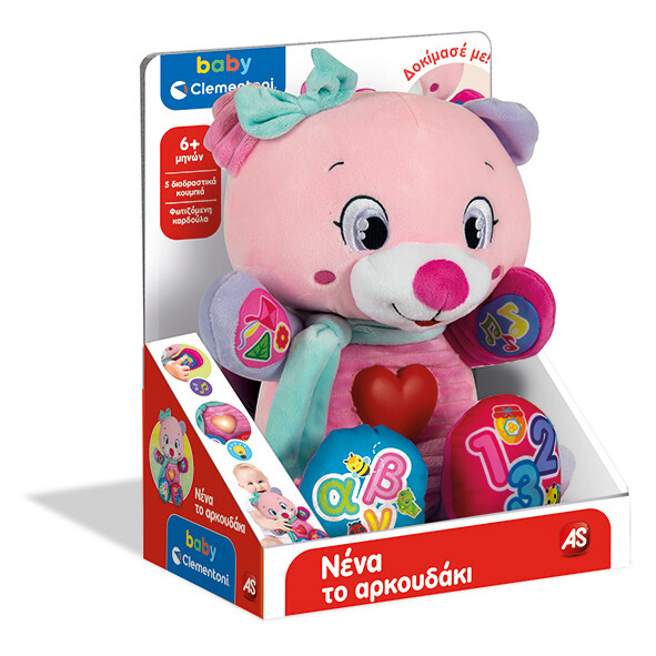 Nena the Bear will become the best friend of the child for many hugs! Soft teddy bear with 5 interactive buttons for the child to learn the first numbers, the first letters, the shapes and the colors. Nena the Bear helps the child to recognize many new words thanks to the happy songs and funny poems.
