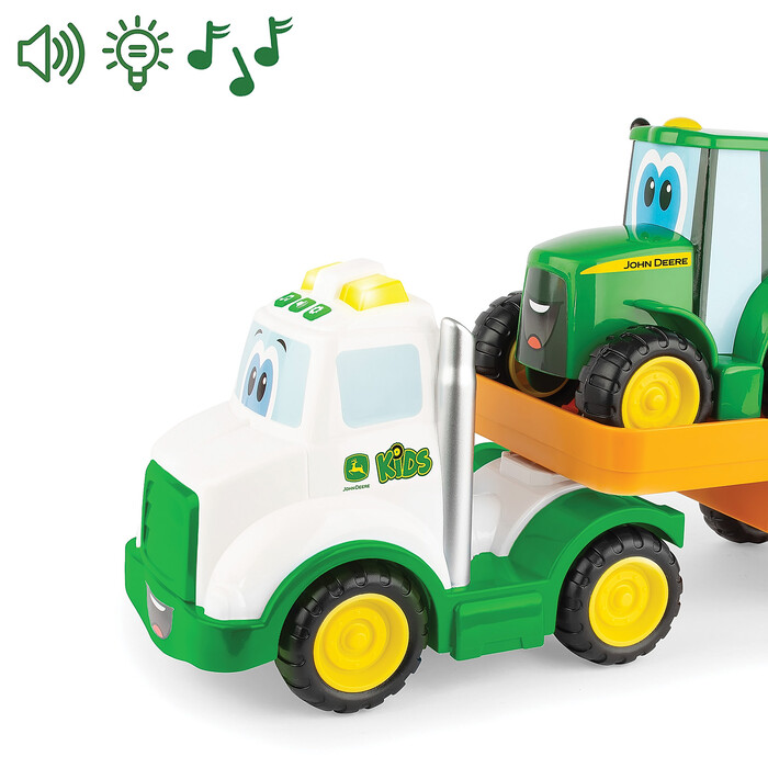 Help your little one get their farm friends from job to job with the John Deere Lights & Sounds Farmin' Friends Hauling Set! This fun farm duo includes a truck with a ramp that raises and lowers, making it easy for the tractor to roll up on board. The hauler truck features lights and sounds for extra fun during playtime and can also be used to haul other Johnny Tractor vehicles. Both toys have free rolling wheels for plenty of push along fun.