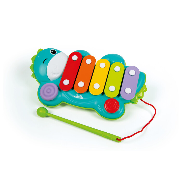 This super-cool dinosaur xylophone invites children to develop their sense of rhythm and compose their own melodies. With 5 coloured plates on the dinosaur?s tummy and a hammer, attached to the instrument with a practical strap.