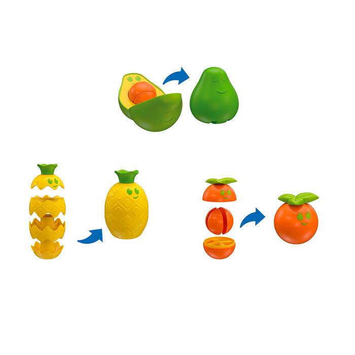 The avocado opens and conceals a ball that must be removed and put back in. The pineapple is made up of stackable elements, the orange opens and conceals 4 slices to be removed and put back inside. Each fruit stimulates different manual exercises and various sensory experiences thanks to their textures.