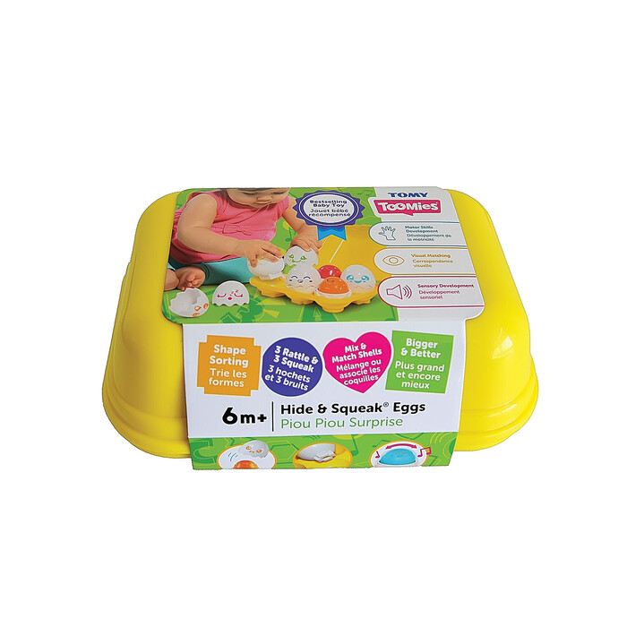 Brighter and better than ever, say hello to this new bold addition to the Hide and Squeak family. These best-selling half-dozen heroes have had a make-over! Hiding inside their sturdy, bright blue box, the eggs now feature fantastic shades of pink, purple, green, yellow, teal and orange. Each and every egg will squeak when your baby presses down, perfect for giggles and surprises. But that s not all. Each has a funny face and wants to be reunited with its bottom half. Moving through key play milestones, children can match the shells by the colour of the faces or the colour of their bases.