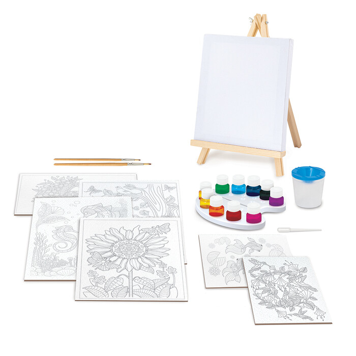 HappiHobbi Acrylic Painting Workshop is the ideal set for the child to learn to paint with the acrylic technique. Draw canvas paintings onto the wooden easel included and give life to the pre-printed designs. It is suitable for children who have their first experience with the acrylic technique, as it contains an illustrated detailed manual that guides the child step by step in their first contact with the technique. In addition, it is equally suitable for children who have already gained experience, as its rich content allows them to color pre-printed cardboards, to create their own works from scratch on white canvas using the stencils included, but also to further practice their imagination and talent in free design.