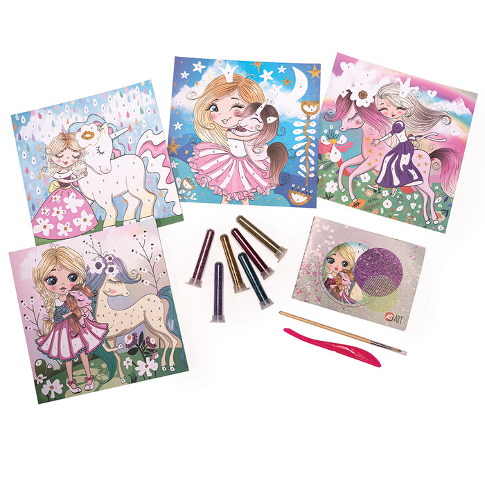 Remove the stickers from the specially numbered areas of the cards with the help of the plastic tool and sprinkle glitter on these areas. Princesses and unicorns come to life through the glow of glitter and transport you to a fairy tale & sparkling world for fun, learning and creative time away from screens.