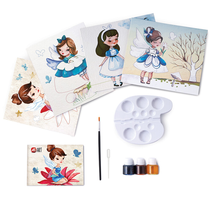 An educational drawing set that guides the child step by step to learn how to paint with the aquarelle technique, creating beautiful fairies. Color mixes and different color intensities will introduce the child to this technique. Use the 3 watercolors as they are or mix them according to the instructions provided in the illustrated guide included and paint the pre-printed cards of different difficulty level, creating real works of art to decorate your room.