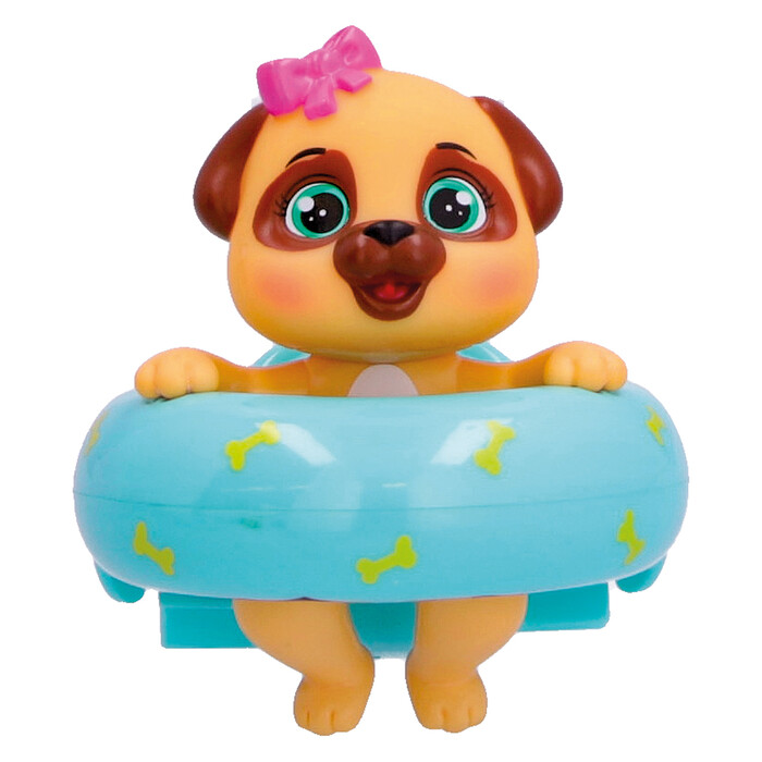 Floaties Puppies are the Bloopies' pets that wear cute swimming floats! All 6 characters have a colourful and playful design. When you pull the rope on the back of the float and put the puppy into the water, they will move as if they are really swimming! The puppies and their floats squirt water and make bubbles through their mouths! Enjoy bath time fun with the Floaties Puppies!