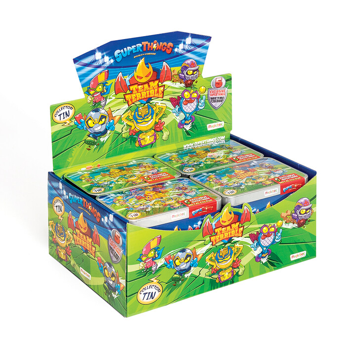 The new SuperThings tin contains 5 supervillains making up the Team Terrible, the terror factor in all sport competitions! Led by Goldor, who only thinks about winning at any price, the SuperThings in Team Terrible make the ground shake as they walk: Pani Pack is a slippery hockey star; Red Kicker, the biggest cheating villain in football; Slam is a crazy tennis maniac; and Tacklehead is unbeatable playing American football. They are the most competitive villains, always ready to try to win any match. Obviously, they never play a clean game! The 5 characters have a metallic finish and are available exclusively in the tin, which you can use it to transport or store your favourite figures!