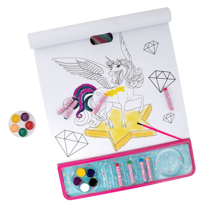 Ποιο παιδί δεν αγαπά τους μονόκερους; Ένα σετ με όλα όσο χρειάζεσαι για να μπεις στον κόσμο μοναδικών μονόκερων και να τους χρωματίσεις με όμορφα χρώματα, κάνοντάς τους να μοιάζουν αληθινοί. Διάλεξε ένα χρώμα από τις κηρομπογιές ή ανάμιξε τα χρώματα νερομπογιάς που θέλεις και χρωμάτισε το μαγικό τους κέρατο, τη χαίτη τους, τις ουρές τους, ουράνια τόξα και πολλές άλλες εικόνες από το μαγικό τους κόσμο.