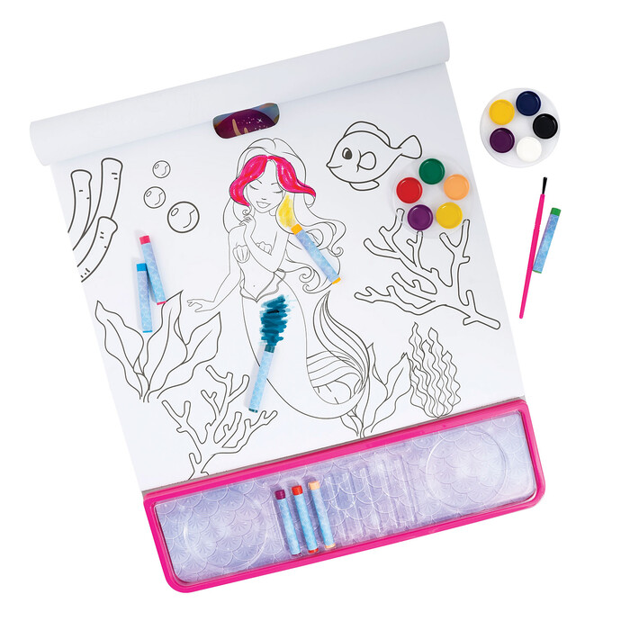 Ποιο παιδί δε μαγεύεται από το φανταστικό κόσμο των γοργόνων; Ένα σετ με όλα όσο χρειάζεσαι για να ταξιδέψεις στο βυθό μαζί με πανέμορφες γοργόνες και να τις χρωματίσεις με όμορφα χρώματα, κάνοντάς τις να μοιάζουν πραγματικές. Διάλεξε ένα χρώμα από τις κηρομπογιές ή ανάμιξε τα χρώματα νερομπογιάς που θέλεις και χρωμάτισε τις γοργόνες, τα μαλλιά τους, τις ουρές τους, θαλάσσια ζωάκια και ψαράκια αλλά και όμορφα θαλάσσια φυτά.